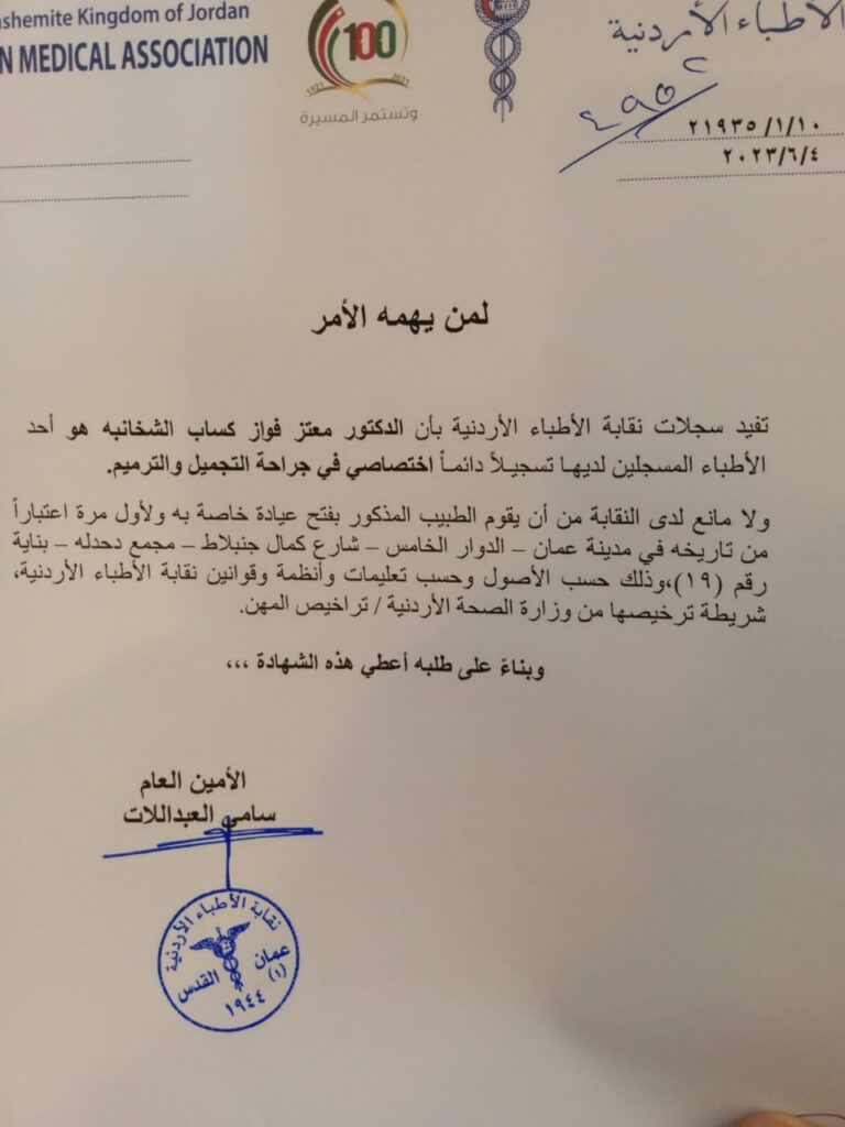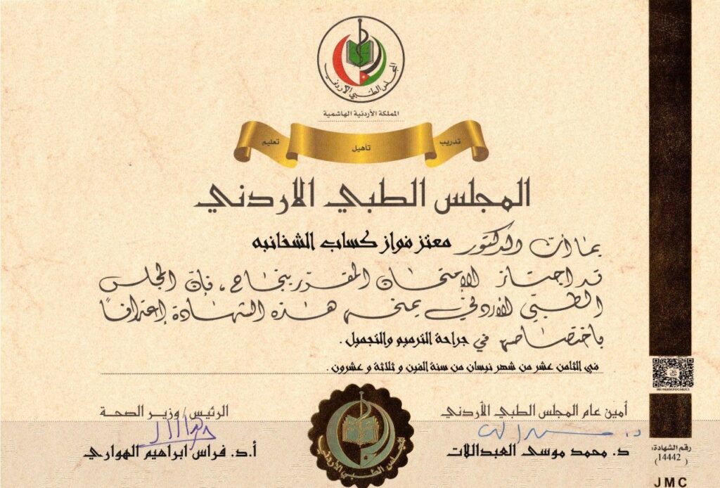 Dr. Mutaz Al-Shakhanbeh is considered one of the leading consultants in plastic, reconstructive, and burn surgery in Jordan. He has over 12 years of experience in cosmetic surgery in Germany, where he trained at numerous hospitals and universities under the supervision of some of Germany’s most renowned plastic and reconstructive surgeons. This extensive training has endowed him with a vast knowledge base and unparalleled skill in cosmetic and reconstructive surgery.