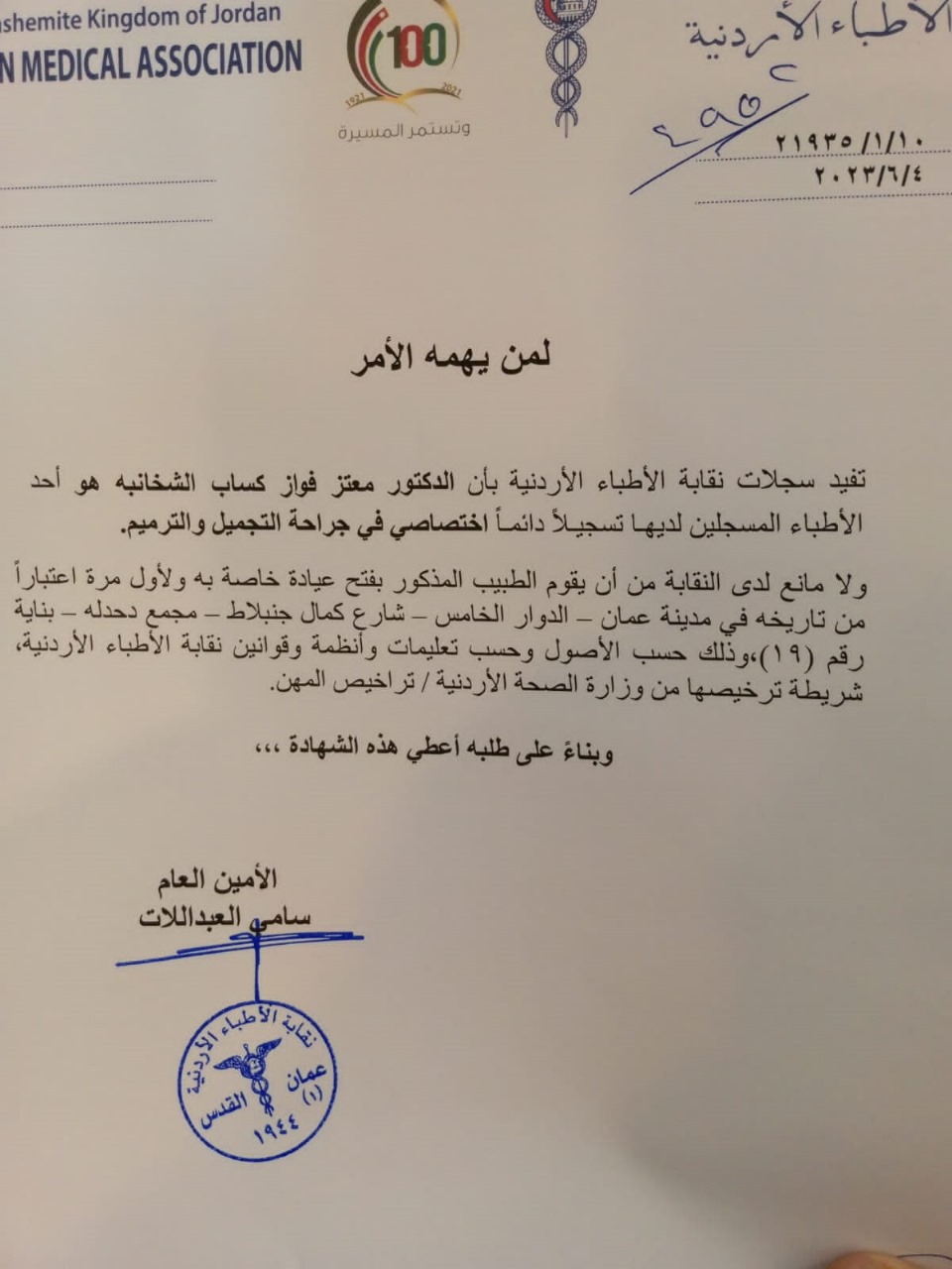 Dr. Mutaz Al-Shakhanbeh is considered one of the leading consultants in plastic, reconstructive, and burn surgery in Jordan. He has over 12 years of experience in cosmetic surgery in Germany, where he trained at numerous hospitals and universities under the supervision of some of Germany’s most renowned plastic and reconstructive surgeons. This extensive training has endowed him with a vast knowledge base and unparalleled skill in cosmetic and reconstructive surgery.